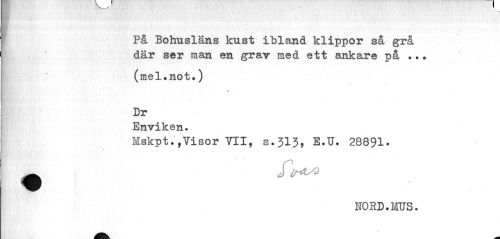 //// ' 'Äf ' n '' * i • ' v 4 ' , • ;flf lfj i i Vs • * •5 t»V1-» *'' i' '.»i i v > • v?l5 f: *• ' 4 •?; 1 ' •4 f" . f^1' ? " #-Vf j r ^ . Y^»'' < • //// - //// På Bohusläns kust ibland klippor så grå //// . //// i ; där ser man en grav med ett ankare på ... //// mm t \ //// (mel.not.) //// < //// P p //// Dr //// Enviken. //// Mskpt.,Visor VII, s.313, E.U. 28891. //// NORD.MUS. ////
