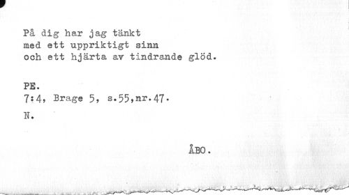 //// i //// På dig har jag tänkt //// med ett uppriktigt sinn //// och ett hjärta av tindrande glöd. //// PE. //// 7:4, Brage 5, s.55,nr.47. N. //// ÅBO. //// « //// ¦ ////
