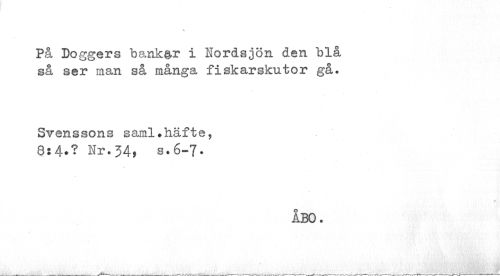 //// % //// På Doggers bank&r i Nordsjön den blå //// så ser man så många fiskarskutor gå. //// Svenssons saml.häfte, //// 8:4-? Nr.34, s.6-7. //// ABO. ////