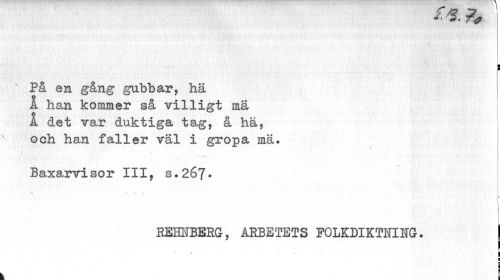 //// • ¦• //// r //// På en gång gubbar, hä (j //// A han kommer så villigt ma 1 det var duktiga tag, å hä, och han faller väl i gröpa mä. //// > i //// Baxarvisor III, s.267- //// r [ //// j //// ... //// REHNBERG, ARBETETS FOLKDIKTNING. | //// i //// i //// E | //// ¦ //// c //// G ////