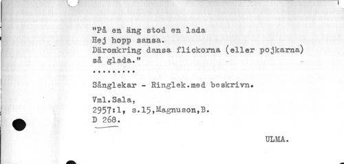 //// i','"' ¦'l}}.V •.y:!-:.vV'- •• 'j«p.'"'."• M i",v • //// MPå en äng stod en lada Hej hopp sansa. //// Däromkring dansa flickorna (eller pojkarna) så glada.» //// Sånglekar - Ringlek.med beskrivn* Vml.Sala, //// 2957*1» s.15,Magnuson,B. ^ D 268. //// ELMA. ////