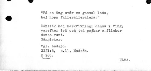 //// "På en äng står en gammal lada, //// ^^ hej hopp falleralleralera.,r //// Danslek med beskrivning; dansa i ring, varefter två och två pojkar o.flickor dansa runt. Sånglekar. //// Vgl. Ledsjö. //// 2221:6, s.ll, Madsén. //// D 268. //// * " ULMÅ. ////