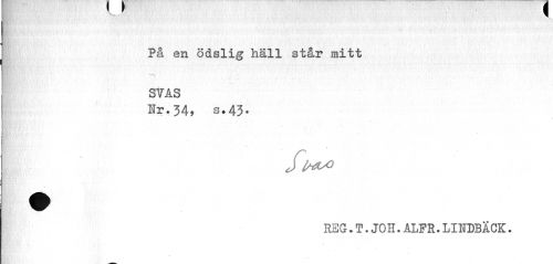 //// På en ödslig häll står mitt SVAS //// Hr.34, s.43. //// » //// | . JM^ //// REG.T.JOH.ALFR.LINDBÄCK. ////