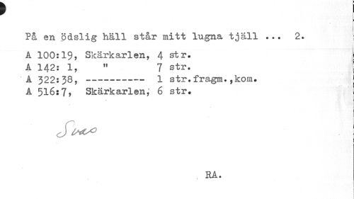 //// I //// k //// i //// På en ödslig häll står mitt lugna tjall 2. ( //// A 100:19? Skärkarlen, 4 str. i //// A 142: 1, 11 7 str. j //// A 322:38, --- 1 str. fragm. , kom. j //// A 516:7> Skärkarlen^ 6 str» //// | //// i 1 t //// J //// RA. //// i ////
