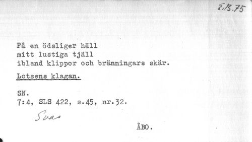 //// På en ödsliger hall mitt lustiga tjäll //// ibland klippor och bränningars skär. Lotsens klagan. //// SN. //// 7:4, SLS 422, s.45» nr.32. //// ÅBO. //// k ////
