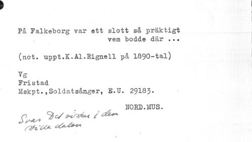 //// • J //// På Falkeborg var ett slott så präktigt //// vem bodde där . //// (not. uppt.K.Al•Rignell på 1890-tal) //// Vg //// Fristad //// Mskpt.,Soldatsånger, E.U. 29I83. //// NORD.MUS. //// / ////