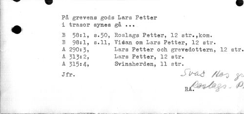//// På grevens gods Lars Petter ^^ i trasor synes gå • «• //// B 58:1, s.50, Roslags Petter, 12 str*,kom. //// B 98:1, s.ll, Viåan om Lars Petter, 12 str. A 290:3? Lars Petter och grevedottern, 12 str. A 313:2, Lars Petter, 12 str. A 315:4, Svinaherden, 11 str. //// Jfr. S t yu ////