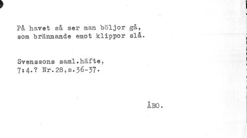 //// I //// I //// v //// På havet så ser man böljor gå, //// som brännande emot klippor slå. ( //// ¦ //// ¦ //// p p //// i //// Svenssons saml.häfte, j //// 7:4.? Nr.28,s.36-37» j //// > //// • l //// i a //// ÅBO. //// i i ////