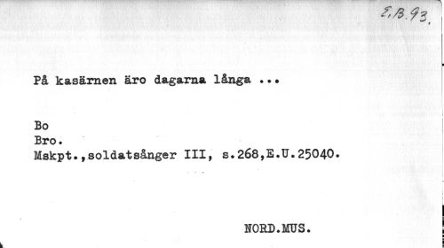 //// <7 3 //// i //// ¦ //// På kasärnen äro dagarna långa ? ?. //// i //// Bo Bro ? //// Mskpt.,soldatsånger III, s.268,E.IJ.25040. //// i //// r //// HORD.MUS. | //// B ////