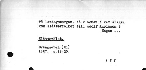 //// På lördagsmorgon, då klockan 4 var slagen kom sl&tterfolket till Adolf Karlsson i //// Hagen «•• //// Slåtterölet. //// Drängsered (Hl) ^^ 1537, s.18-20. //// 7 P F. ////
