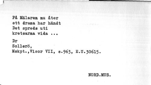 //// På Mälaren nu åter ett drama har händt Det spreds uti kretsarna vida .•• //// Dr //// Sollerö, //// Mskpt.,Visor VII, s.963, E,U*306l5. //// s. //// HOED.MUS. //// • ////