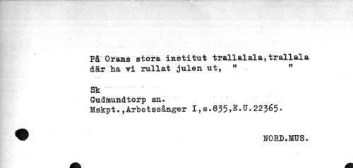 //// Bi 11 //// ...< > ¦ - //// På Orans störa institut trallalala,trallala där ha vi rullat julen ut, » . " //// BfiiMuJ //// Sk ... ' • //// Gudmundtorp sn. //// Mskpt.,Arbetssånger I,s.835,E.U.22365. ^ HORD.MUS. ////