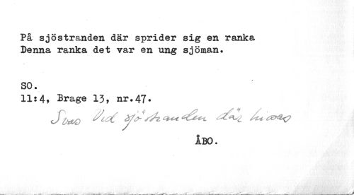//// På sjöstranden där sprider sig en ranka Denna ranka det var en ung sjöman. //// SO. //// 11:4, Brage 13, nr.47. //// ÅBO. ////