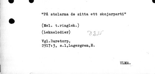 //// f,På stolarna de sitta ett skojarparti11 //// ^^ (Mel. t»ringlek.) //// (Lekmelodier) //// Vgl.Daretorp, //// 2917?3, s.l,Lagergren,E. //// > //// * //// ULM A. //// ¦ •• //// ---. ////