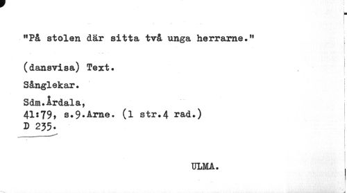 //// I //// r //// f,På stolen där sitta två unga herrarne .M //// i //// (dansvisa) Text. //// i //// Sånglekar. j //// Sdm.irdala, //// 41:79, s.9.Arne. (l str.4 rad.) //// D 235- //// i //// ULM A. ////