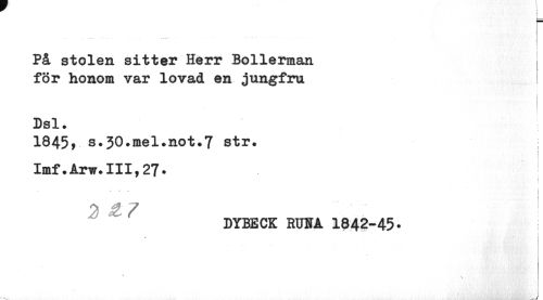 //// I //// På stolen sitter Herr Bollerman för honom var lovad en jungfru //// i //// Dsl. //// 1845, s.30.mel.not»7 str. Imf.Arw.III,27. //// « //// , . i //// DYBECK RUNA 1842-45- //// > i ////