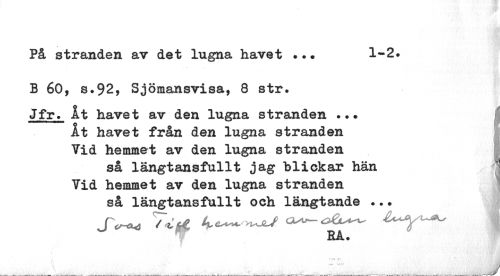 //// På stranden av det lugna havet ..* 1-2. //// B 60, s.92, Sjömansvisa, 8 str. //// Jfr. Åt havet av den lugna stranden ... //// Åt havet från den lugna stranden § //// Vid hemmet av den lugna stranden //// så längtansfullt jag "blickar hän | //// Vid hemmet av den lugna stranden //// så längtansfullt och längtande ... //// JV*4 iA^Y^ //// RA. //// ___ ___, ., . ^J ////