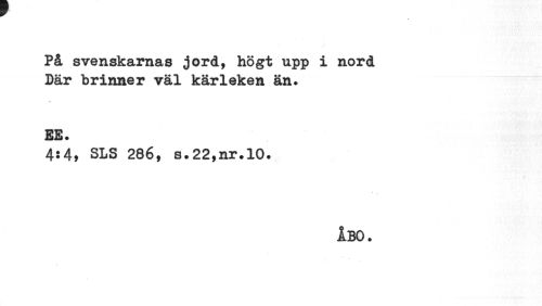 //// På svenskarnas jord, högt upp i nord Där brinner väl kärleken än. //// ém //// EE. //// 4:4, SLS 286, s.22,nr.10. //// ÅBO. ////