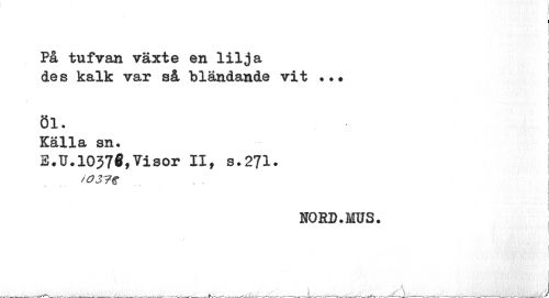 //// I //// i l i //// På tufvan växte en lilja //// des kalk var så bländande vit ? //// öl. //// Källa sn. //// E.U.1037A,Visor II, s.271. //// /O 37$ .. i //// f //// ¦ //// « //// NORD.MUS. //// I //// ^ ^^ __,. , v. - sS ////