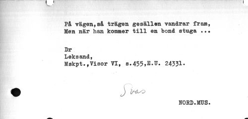 //// På vägen,så trägen gesällen vandrar fram, Men när han kommer till en bond stuga .?• //// Dr //// Leksand, //// Mskpt.,Visor VI, s.455,E.U. 24331- //// tffc \ iM.-o //// HORD.MUS. ////