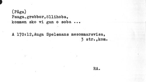 //// t //// (Påga) //// Pauga,grebbor,öllihoba, //// kommen sko vi gan o soba •.? i //// V //// A 170:12,Auga Spelemans mesommarsvisa, //// 3 str.,kom# //// v • //// RA. ////