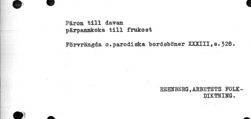 //// Päron till davan pärpannkoka till frukost //// Förvrängda o.parodiska bordsböner XXXIII,s.328. //// REHNBERG,ARBETETS FOLKDIKTNING . //// M. I ////