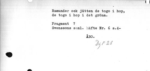 //// Ramunder ock jätten de togo i hop, de togo i hop i det gröna. //// Fragment ? //// Svenssons saml. häfte Nr. 6 s.4- //// ÅBO. //// 0 ////