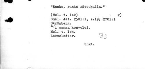 //// "Ranka, ranka räveskalla.11 //// (Mel. t. lek) x) //// Smål. Jät. 2581:1, s.19» 2701:1 Strömberg. //// samma konvolut. Mel. t. lek.* Lekmelodier. //// ULMA. ////