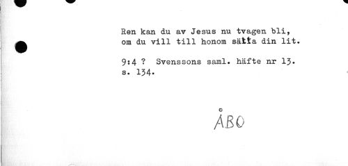 //// Ren kan du av Jesus nu tvagen bli, ^ om du vill till honom sätta din lit. //// 9:4 ? Svenssons saml. häfte nr 13. s. 134* //// ÅBO ////