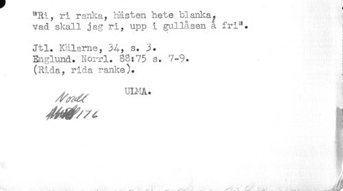 //// 1 //// ttRi, ri ranka, hästen hete blanka, j //// vad skall jag ri, upp i gullåsen å fri'*. I //// > . i //// i //// Jtl. Kälarne, 34, s. 3. Englund. Horrl. 38:75 s. 7-9. //// (Rida, rida ranke). //// m!A- i //// J ////