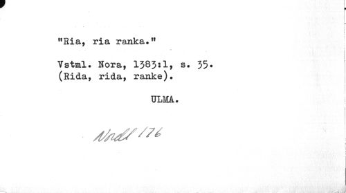 //// B //// "Ria, ria ranka." //// ... • <v //// Vstml. Hora, 1383:1, s. 35* (Rida, rida, ranke). //// ULM. //// t //// t j //// ! i //// i ////