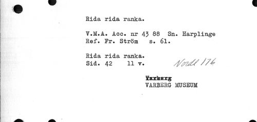 //// / A k m ¦ //// Rida rida ranka. //// * //// Y.M.Å. Acc. nr 43 88 Sn. Harplinge Ref. Fr. Ström s. 61. //// Rida rida ranka. //// Sid. 42 11 v. 4/Mf /74 //// Xsxksrg //// VARBBRG MUSEUM //// K ////