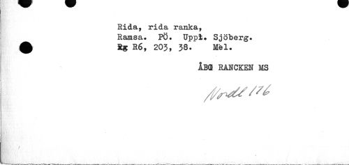 //// Rida, rida ranka, Ramsa. PÖ. Uppl. Sjöberg. £ 8g r6, 203, 38. mél. //// åb(b ranckeh ms //// * ////