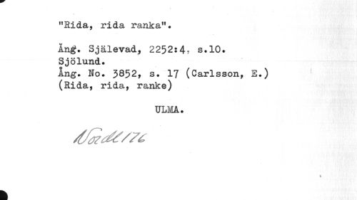 //// "Rida, rida ranka". //// Ang. Själevad, 2252:4, b.10. Sjölund. //// Ang. No. 3852, s. 17 (Carlsson, E.) (Rida, rida, ranke) //// ULMA. //// t. //// k ////