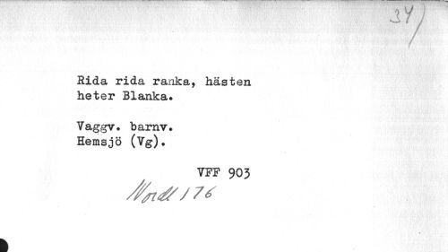 //// , y //// Rida rida ranka, hästen heter Blanka. //// Vaggv. barnv. Hemsjö (Vg)* //// VFF 903 //// 1 ////