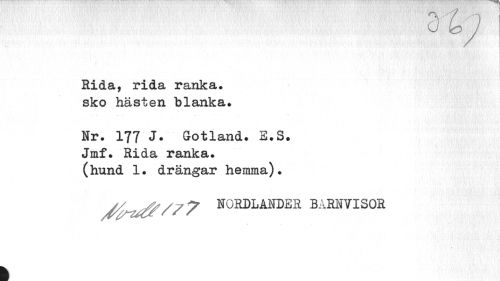 //// ' ' ! '. . ' . i"' i i ' . i» 'J J ' ' : '' - ¦' ' ' , ' • '1 //// Rida, rida ranka, sko hästen blanka. //// Nr. 177 J. Gotland. E.S. //// Jmf. Rida ranka. //// (hund 1. drängar hemma). //// 7 NORDLANDER BARNVISOR //// I ////
