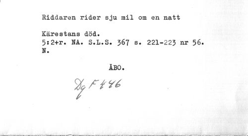 //// Riddaren rider sju mil om en natt Kärestans död. //// 5:2+r. NA. S.L.S. 367 s. 221-223 nr 56. N. //// ÅBO. //// % / Y ** ////