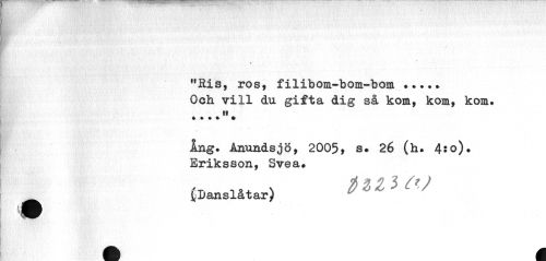 //// ¦ //// « //// "Ris, ros, filibom-bom-bom ... //// Och vill du gifta dig så kom, kom, kom. tt //// ... . //// •. v //// ing. AnundsjÖ, 2005, s. 26 (h. 4:o). Eriksson, Svea. //// ^^ (Danslåtar) ////
