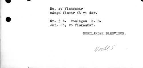 //// Ro, ro fiskeskär många fiskar få vi där. //// ^^ Nr. 5 B. Roslagen E. S. //// Jmf. Ro, ro fiskaskär. //// NORDLANDER BARNVISOR. //// f - ////