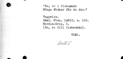 //// "Ro, ro i f i skalkar Många fiskar får du där.11 //// Vaggvisa. //// Sdml. Flen, 14832, s. 100. //// Nordin-Grip, I. //// (Ro, //// ro till fiskeskär). //// ULM. //// y ////