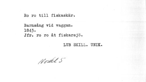 //// Ro ro till fiskaskär. Barnsång vid vaggan. //// 1843- //// Jfr. ro ro åt fiskarsjö. //// LUB SKILL. UNIK. //// z/^é/ y ////