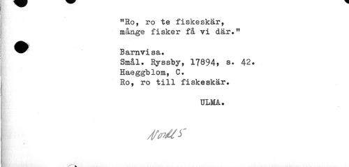//// f //// f,Ro, ro te fiskeskär, månge fisker få vi där." //// ^^ Barnvisa. //// Smål. Ryssby, 17894» s. 42. //// Haeggblom, C. //// Ro, ro till fiskeskär. //// ULMA. //// /tftnMS' //// % ////