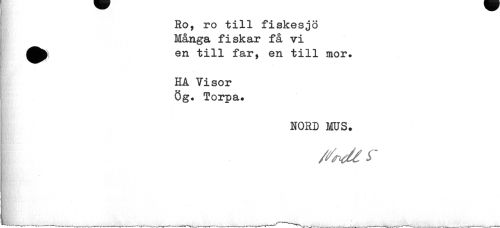 //// Ro, ro till fiskesjö Många fiskar få vi ^^ en till far, en till mor. //// HA Yisor Ög. Torpa. //// NORD MUS* //// # ////