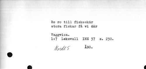 //// ¦ //// Ro ro till fiskeskär stora fiskar få vi där //// Vaggvisa. //// Is7 Leksvall IHE 37 s. 230. //// A m ¦ B //// ^H H //// 1 ////