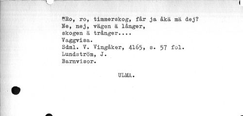 //// !5Ro, ro, timmerskog, får ja åka mä dej? Ne, nej, vägen ä långer, skogen ä trånger... Vaggvisa. //// Sdml. V. Vingåk er, 4165* s* 57 fol. //// Lundström, J. //// Barnvisor» //// ULMk. ////