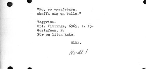 //// "Ro, ro vyssjebarn, skaffa mig en bulla." //// Vaggvisa. //// Upl. Vittinge, 6965, s. 13. //// Gustafson, E. //// För en liten kaka. //// ULMå. //// /1/rM / ////