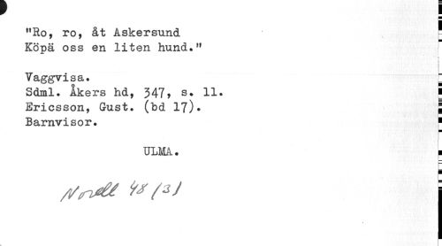 //// r ¦ //// "Ro, ro, åt Askersund = Köpä oss en liten hund." //// i //// Vaggvisa. ^ //// Sdml. Åkers hd, 347, s. 11. ¦ Ericsson, //// Gust. (bd 17). I //// Barnvisor. ¦ //// 1_ //// r //// 1 //// TJLMå. p //// j //// F //// 1 //// ¦ //// /tfrvét /zJ i ////