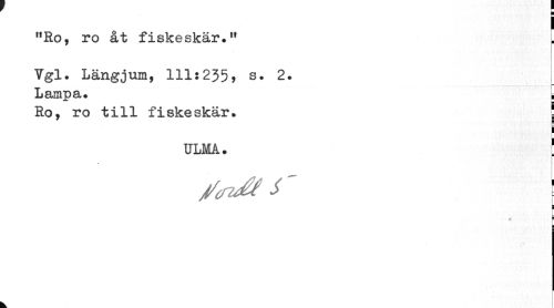 //// i //// "Ro, ro åt fiskeskär." t //// Vgl. Längjum, 111:235, s. 2. //// r //// Lampa. s //// u //// Ro, ro till fiskeskär. \ //// i //// ULMA. ! //// ¦ //// I //// # ! i //// r //// ¦ ////