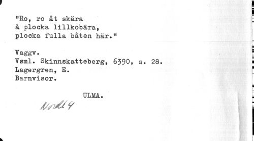 //// i //// "Ro, ro åt skära E //// å plocka lillkobära, , //// plocka fulla båten här»" //// Vaggv. I //// Vsml. Skinnskatteberg, 6390, s. 28. i //// Lagergren, B. f //// Barnvisor. //// g //// i //// ULMA. . //// \ ////