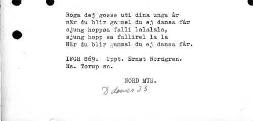 //// Roga dej gosse uti dina unga år när du blir gammel du ej dansa får //// •sjung hoppsa falli lalalala, //// \ //// sjung hopp sa fallirel la la //// När du blir gammal du ej dansa får. //// » //// IFGH 869. Uppt. Ernst Nordgren. Ha. Torup sn. //// NORD MUS. ////